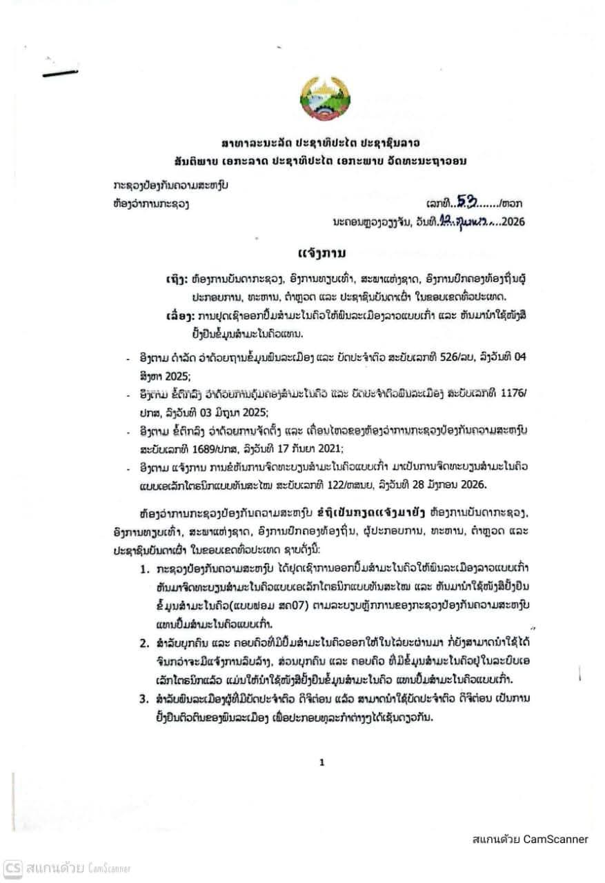 ອີງຕາມ ແຈ້ງການ ການຂໍຫັນການຈົດທະບຽນສຳມະໂນຄົວແບບເກົ່າ ມາເປັນການຈົດທະບຽນສຳມະໂນຄົວແບບເອເລັກໂຕຣນິກແບບທັນສະໄໝ ສະບັບເລກທີ 122/ຫສນຍ, ລົງວັນທີ 28 ມັງກອນ 2026.