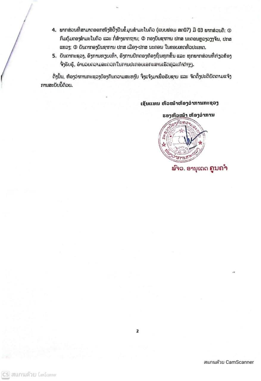 ດັ່ງນັ້ນ, ຫ້ອງວ່າການກະຊວງປ້ອງກັນຄວາມສະຫງົບ ຈິ່ງແຈ້ງມາເພື່ອຮັບຊາບ ແລະ ຈັດຕັ້ງປະຕິບັດຕາມແຈ້ງການສະບັບນີ້ດ້ວຍ.