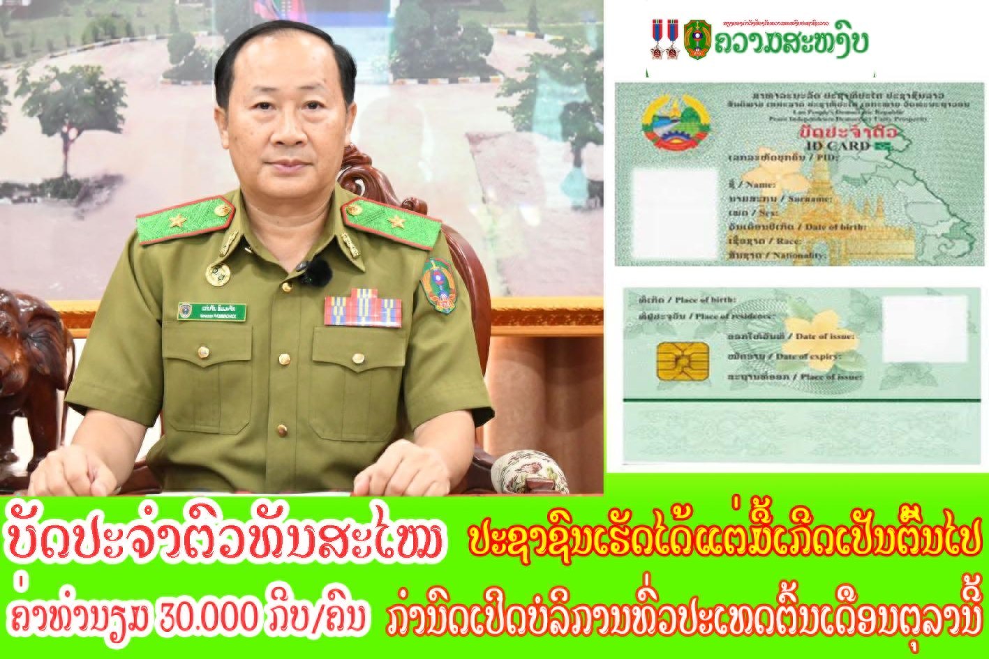 ທ່ານກ່າວອີກວ່າ: ກ່ອນໄປຂໍອອກບັດປະຈໍາຕົວໃຫ້ພົນລະເມືອງກະກຽມເອກະສານເບື້ອງຕົ້ນແມ່ນ: ປື້ມສຳມະໂນຄົວ, ບັດປະຈໍາຕົວແບບເກົ່າ (ບັດສີຂຽວ) ຫຼື ກ໋ອບປີ້ພັດສະປອດ ສ່ວນຄ່າບໍລິການອອກບັດແມ່ນ 30.000 ກີບ.