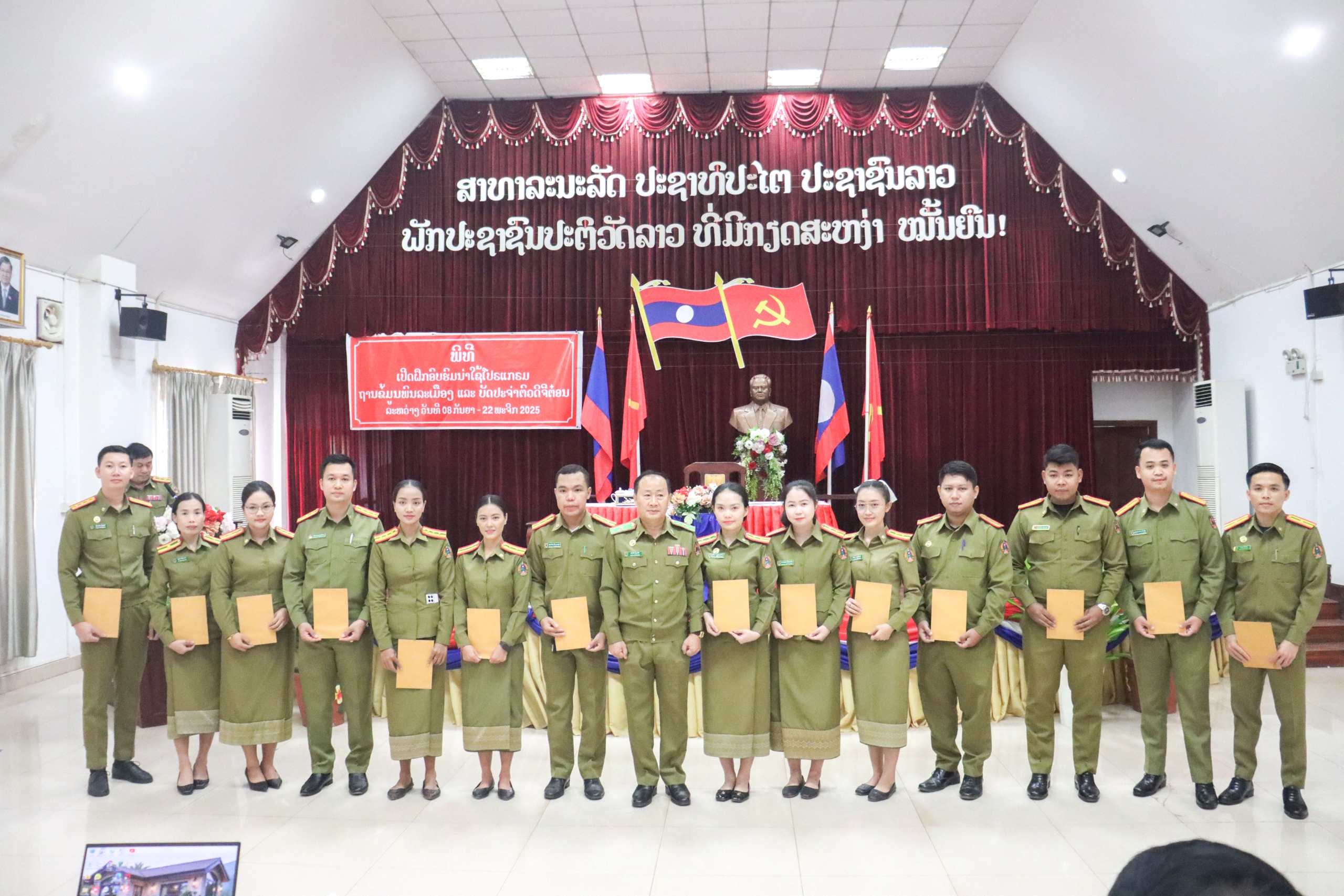 ໃນວັນທີ 17 ພະຈິກ 2025 ຢູ່ທີ່ສະໂມສອນຊັ້ນ 4 ກົມຄຸ້ມຄອງສໍາມະໂນຄົວແລະກໍ່ສ້າງຮາກຖານກະຊວງປ້ອງກັນຄວາມສະຫງົບ ໄດ້ຈັດພິທີປິດຝຶກອົບຮົມນຳໃຊ້ໂປຣແກຣມໂຄງສ້າງຖານຂໍ້ມູນພົນລະເມືອງ ແລະ ບັດປະຈຳຕົວດິຈິຕ໋ອນໃຫ້ພະນັກງານກົມຄຸ້ມຄອງສຳມະໂນຄົວ ແລະ ກໍ່ສ້າງຮາກຖານ, ໂດຍໃຫ້ກຽດເປັນປະທານຂອງ ທ່ານ ພົນຈັດຕະວາ ແກ່ນຈັນ ພົມມະຈັກ ຄະນະພັກກະຊວງເລຂາຄະນະພັກ, ກົມຫົວໜ້າກົມຄຸ້ມຄອງສຳມະໂນຄົວ ແລະ ກໍ່ສ້າງຮາກຖານ, ມີບັນດາ ຄະນະພັກ-ຄະນະກົມ, ຄູອາຈານ ແລະ ນັກສໍາມະນາກອນ ເຂົ້າຮ່ວມ 172 ສະຫາຍ ຍິງ 48 ສະຫາຍ.